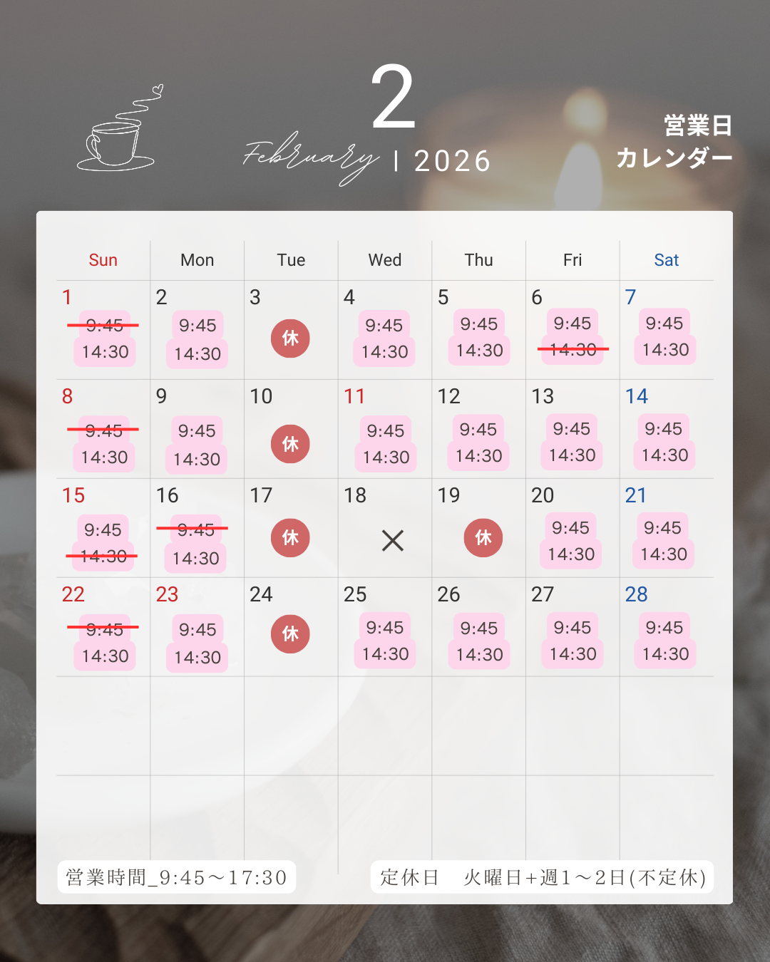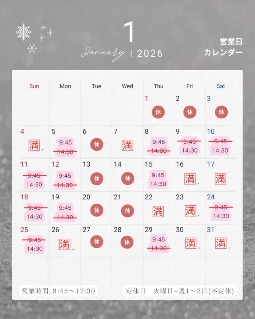 2026年1月/2月のご予約空き状況 2025年12月19日 最終更新日時 : 2025年12月19日 みっちーさん ※ご予約・火曜日以外の休業日は随時変化しております。更新が間に合ってない場合がございます。ご理解のほど、よろしくお願い致します。 Follow me! FacebookXBlueskyHatenaCopy