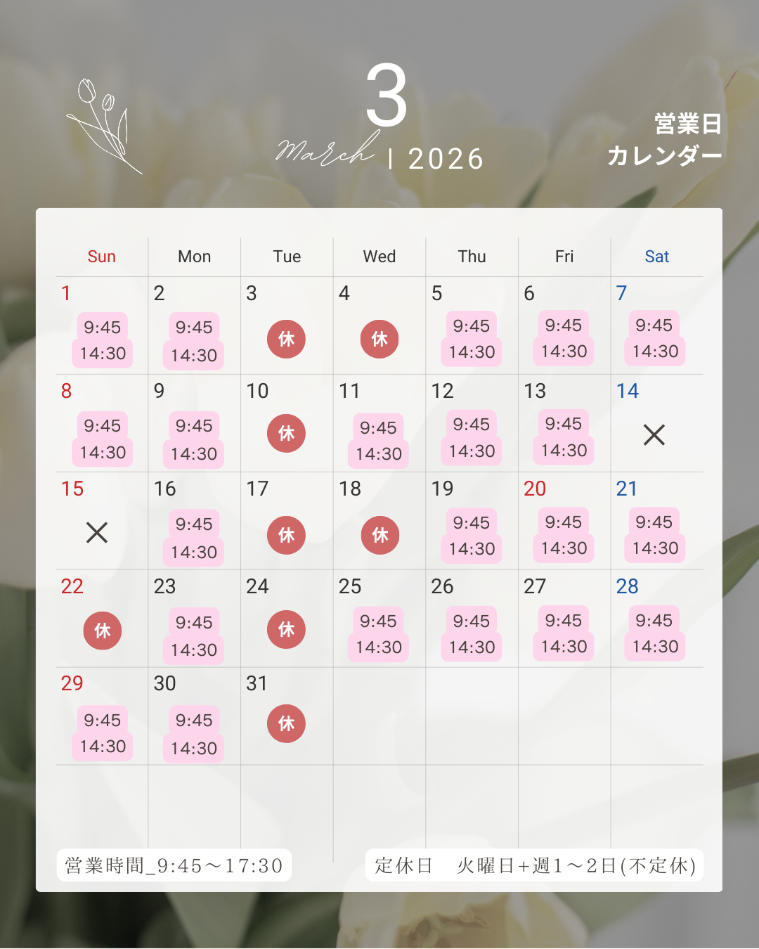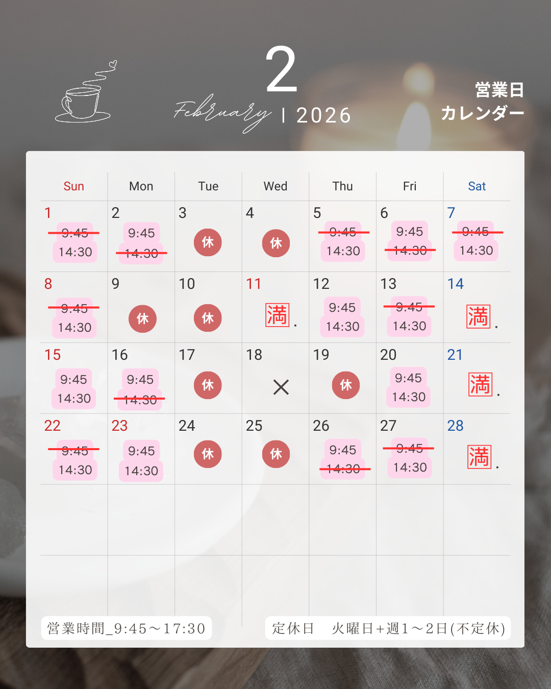 2026年2月/3月のご予約空き状況 2026年1月19日 最終更新日時 : 2026年1月19日 みっちーさん ※ご予約・火曜日以外の休業日は随時変化しております。更新が間に合ってない場合がございます。ご理解のほど、よろしくお願い致します。 Follow me! FacebookXBlueskyHatenaCopy